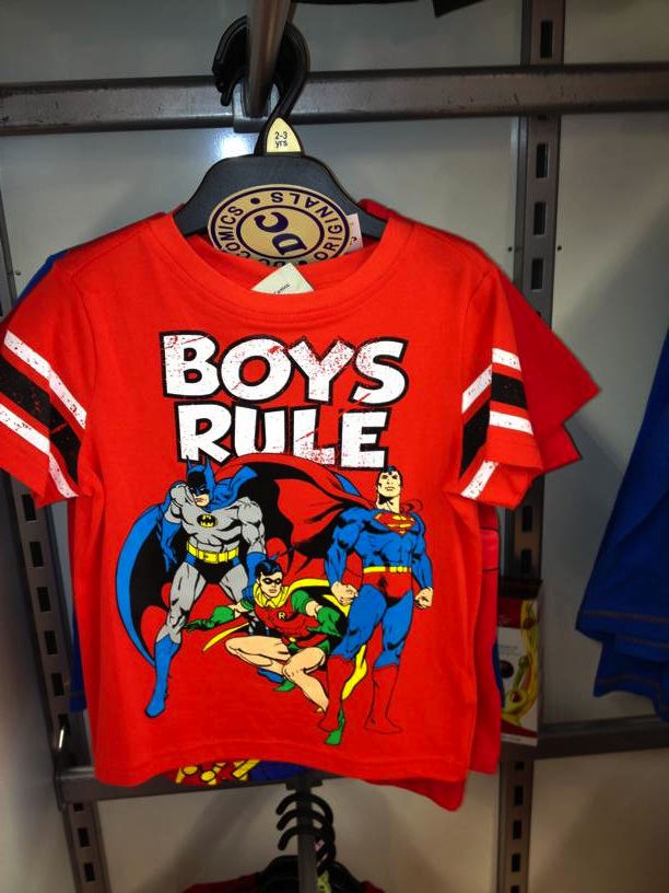 Much as it grieves me to say it, these are campaigns concerning “girls” toys, “girls” things; but there are also examples that come to mind about boys’ or men’s clothing being challenged, sometimes for overtly sexist messages, sometimes potentially inciting abusive behaviour or encouraging violence against women. Generally though the message on younger boys’ clothing has been considered more positive, one of outdoor action, saving the world, a fixation with heavy machinery and outer space, large animals or cheekiness. Search your local store online and you’ll see what I mean. It is argued that they promote more positive images and aspirations, support high self-esteem and encourage a sense of achievement.