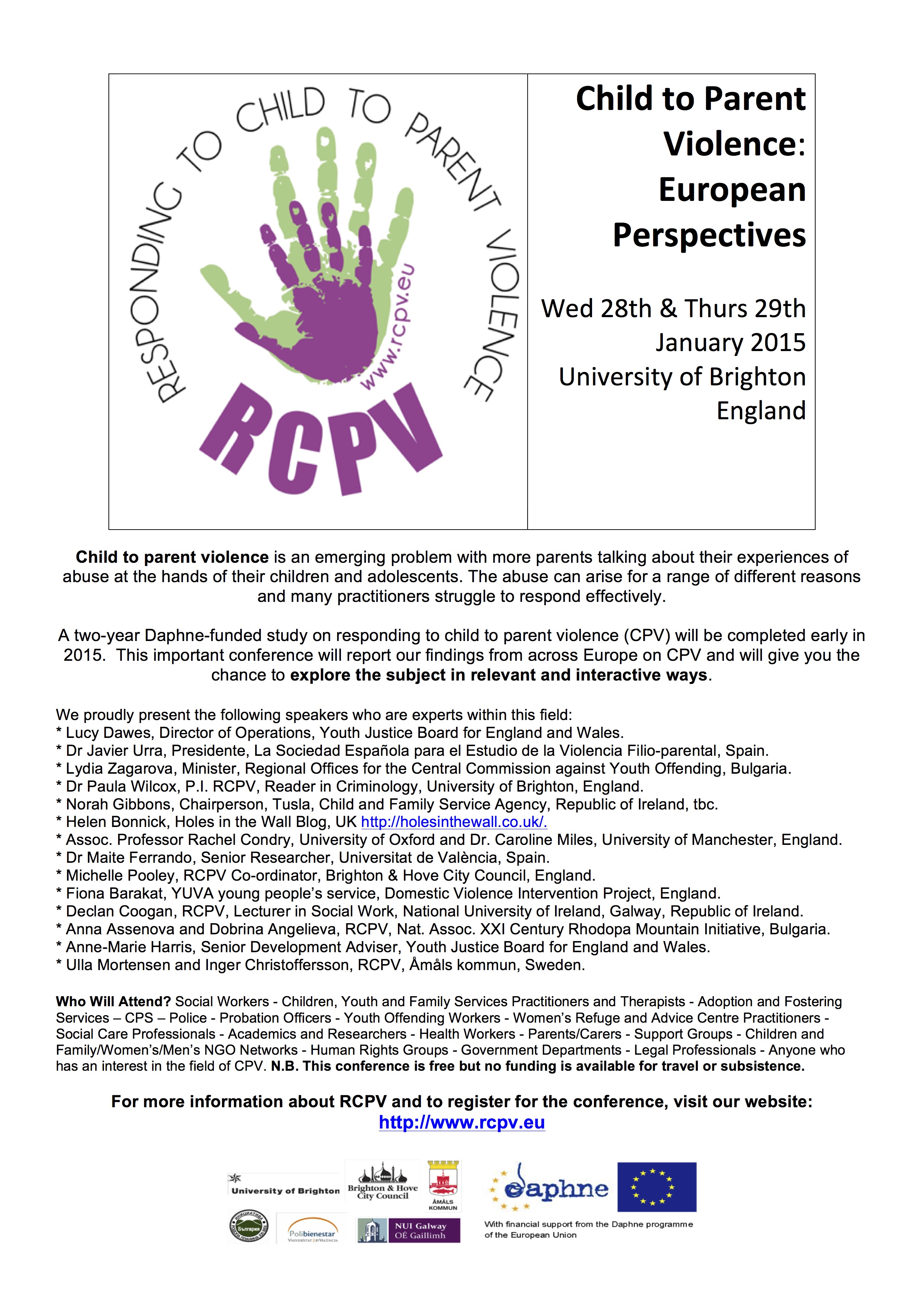 I am pleased to post details and the call for abstracts for the final conference of the Daphne Responding to Child to Parent Violence Project, to be held over two days in Brighton in January 2015. This has been a two year action research project comparing two separate responses to CPV and examining the development of awareness and work across five different European countries.
