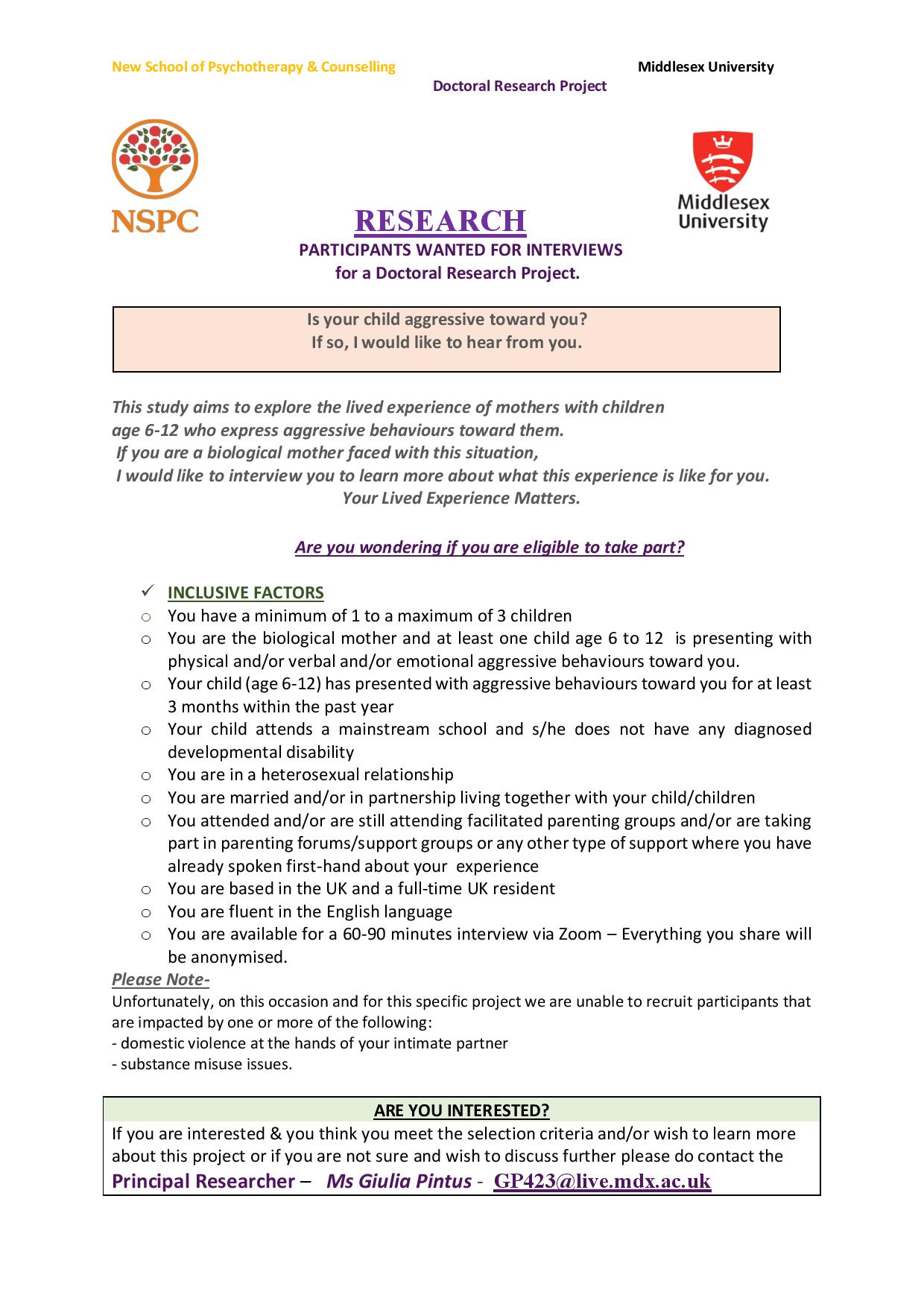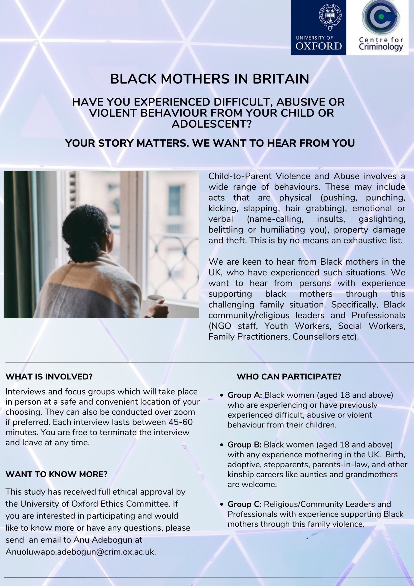 There are currently 2 requests for help with research in the UK that I am aware of. Giulia Pintus at Middlesex University, hopes to find 2 more participants for her work with mothers of children aged 6 – 12, expressing aggressive behaviour towards them; and Anu Adebogun at Oxford University has just started recruiting for her important work with black mothers experiencing “difficult, abusive or violent behaviour” from their child or adolescent. If you can help by passing on the information in these requests, I am sure the researchers would be immensely grateful.
