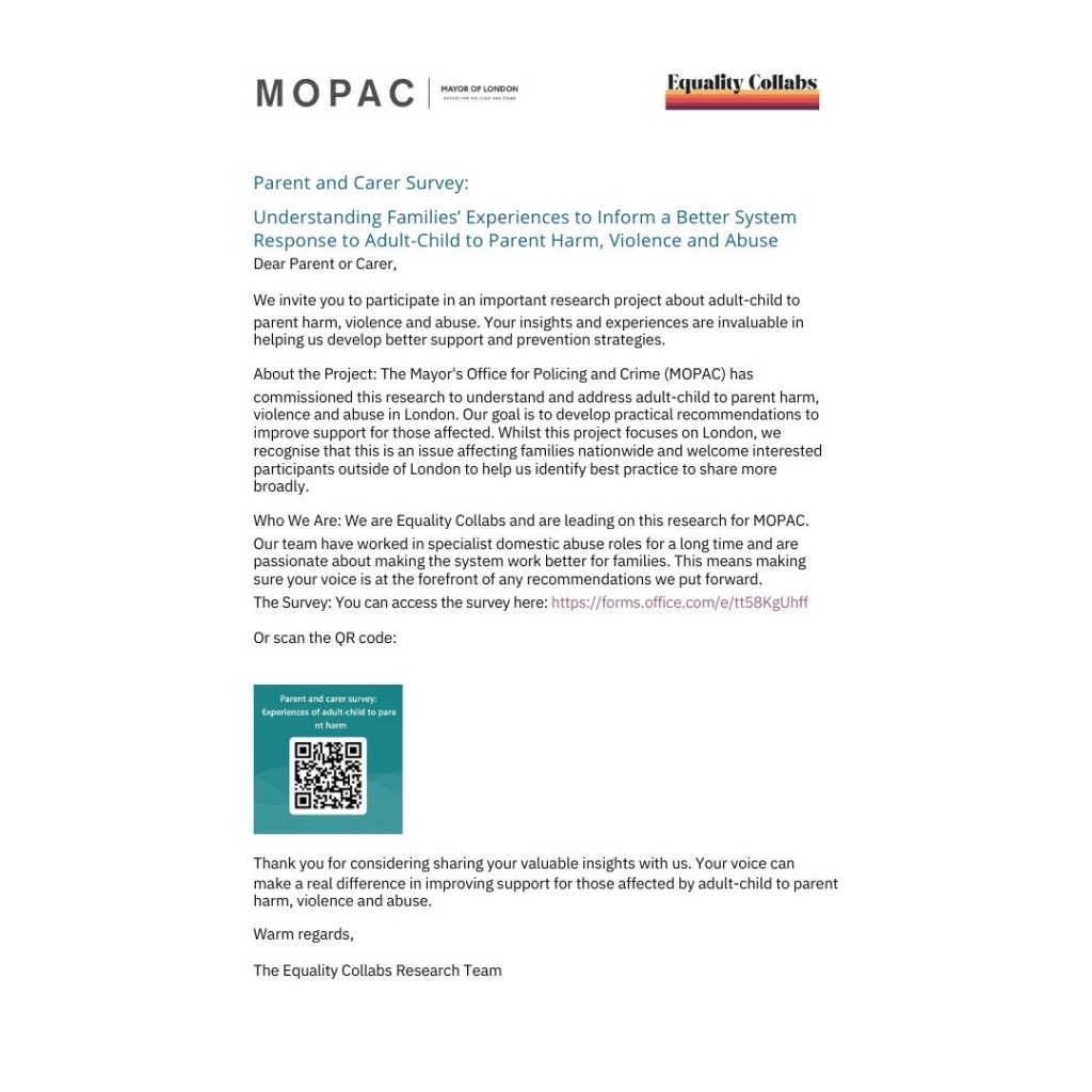 I am pleased to post this request from Equality Collabs who have been commisioned by the Mayor’s Office for Police and Crime (MOPAC) to undertake research to enable better understanding around adult-child to parent harm, violence and abuse. The project focuses on the London area, but responses are welcomed from parents and carers around the country.