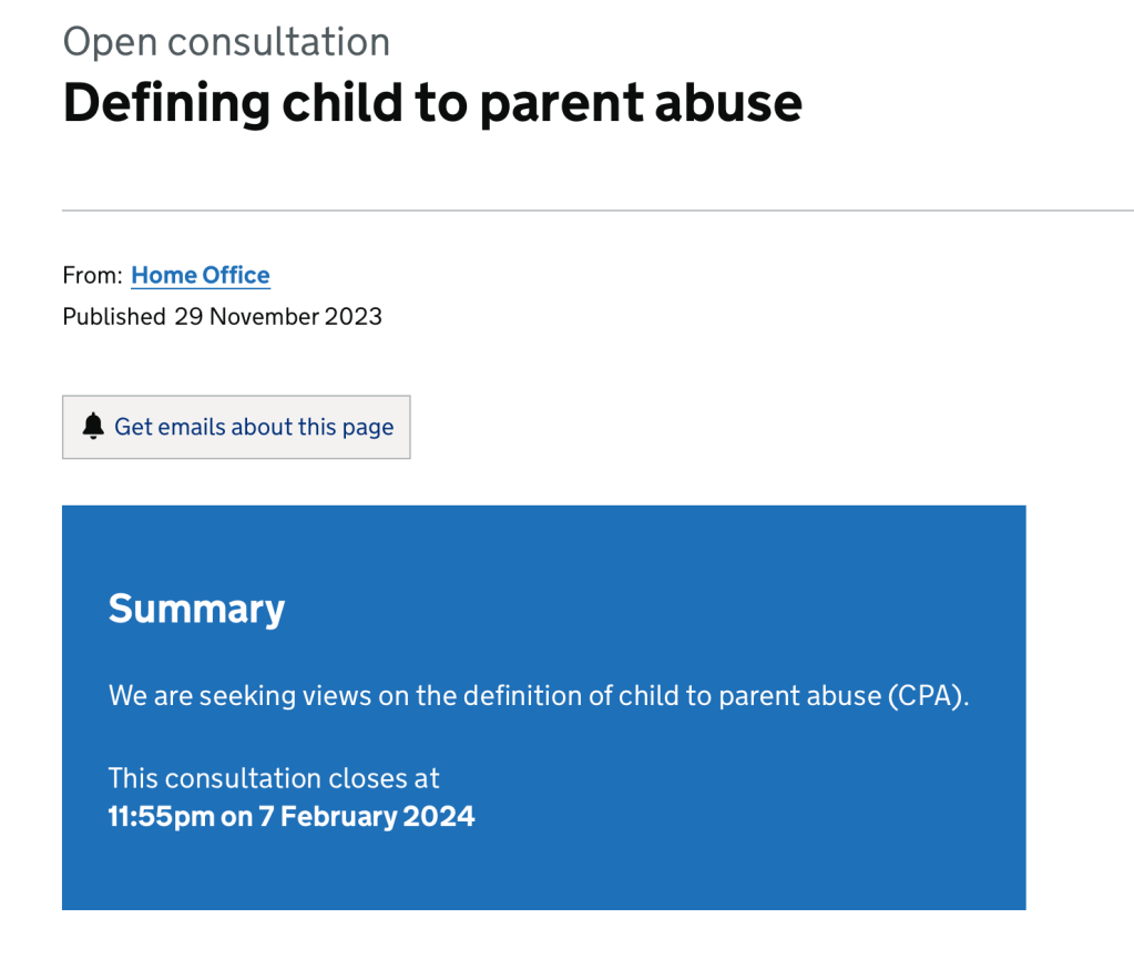 After many years of meetings, changes of staff, changes of emphasis and focus on adult domestic abuse, the 2022 Policy Paper, Tackling Domestic Abuse included a commitment to developing a sector agreed definition; and I am thrilled to announce that we finally have a public consultation on the definition of child to parent abuse, which will include space to comment on terminology. The team at the Home Office have been working on this for many months, speaking to key stakeholders in order to produce the consultation framework. The consultation is open till 7th February, so please do take the time to have a look and send in your comments.