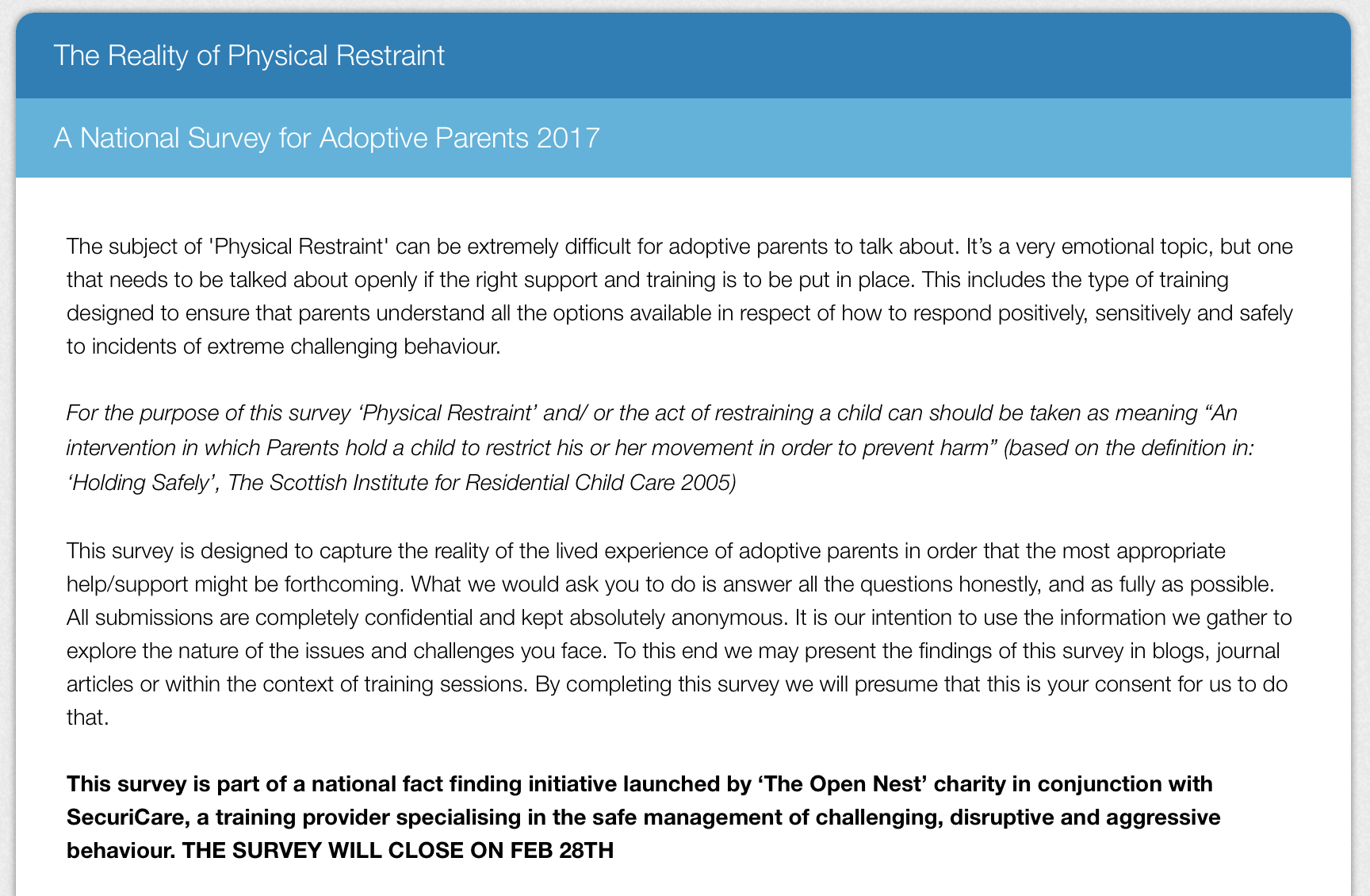 Part 2, this week, from Lee Hollins. In this blog Lee further develops the understanding of restraint, with the concept of “safe and therapeutic holding”; and explains how they can be introduced as an aid to keeping children safe. Many thanks to Lee for writing these two blogs. It’s always good to hear from someone else, bringing as it does a greater breadth to the discussion and to our knowledge and understanding.